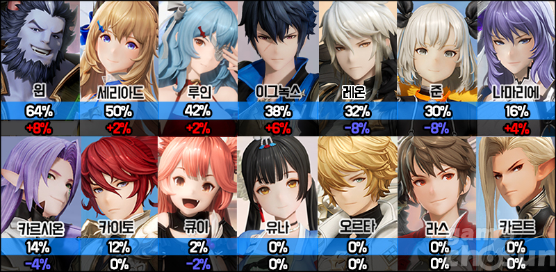 윈·세리아드·루인 조합이 다시 만났다. 윈이 여전히 1위를 지키고 있는 가운데 세리아드가 다시 50%를 회복하였고, 루인도 부지런히 올라와 세 캐릭터가 1, 2, 3위를 나란히 차지했다. 그 뒤를 이그녹스가 6% 상승으로 따라잡았고, 최근 급성장을 보여준 레온은 8% 감소하며 32%에 머물렀다.