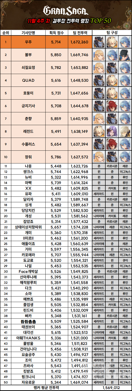 랭커 평균 전투력은 지난 랭킹 대비 98 상승한 1,569,012다. 츠루기 초월 강림이 추가되었지만, 아직 1주 차인 만큼 결투장에 영향을 주지 못했고, 상위 랭크들 역시 조합에 큰 변화 없이 윈과 세리아드, 루인, 준 등 키우던 캐릭터에게 계속 투자를 하고 있기 때문이다.