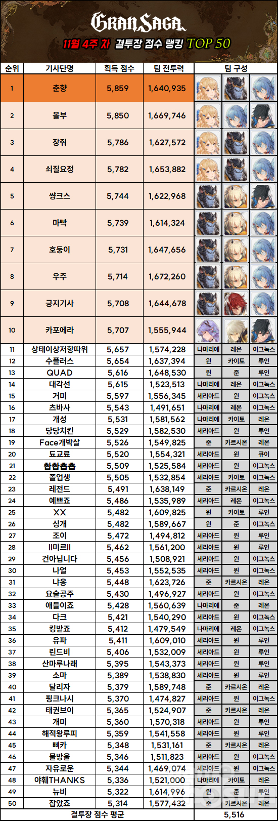 그랑사가 94주 차 결투장 랭킹, 점수 1위는 '춘향', 전투력 1위는 '우주'가 차지했다