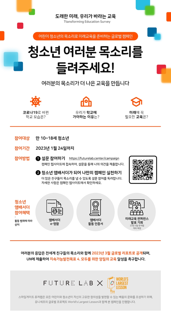 한편, 퓨처랩에서는 본 캠페인의 청소년 앰배서더를 선정하여 어린이와 청소년 스스로가 교육의 변화를 주도할 수 있도록 지원한다. 모집은 2023년 1월 10일까지이며, 앰배서더로 선정된 청소년들에게는 활동인증서와 퓨처랩 미래교육 컨퍼런스 발표 기회 등을 제공한다.