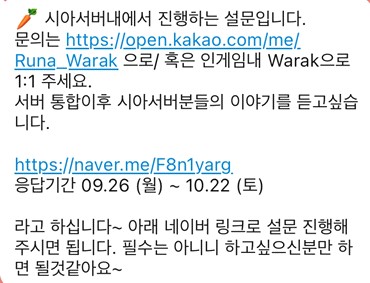 와락: 처음엔 킹덤 내부에서 설문조사를 진행하다가 시아 서버의 다른 분들과도 함께 하면 좋을 것 같아 서버 오픈 채팅방으로 다른 분들께 설문을 전달하게 됐고 많은 분들이 참여해 주셨습니다. 설문은 9월 26일부터 10월 22일까지 약 한 달에 걸쳐 네이버 폼을 통해 진행되었습니다. 칼리아 서버에서 어느 분께서 포럼에 설문조사를 진행하시는 것을 보고 '오~! 나도 해봐야지'라는 생각을 갖게 된 것도 있습니다ㅋㅋㅋㅋ