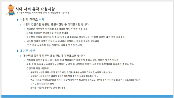 Q. GM 노트를 통해 공식 답변이 왔다. 서버 불균형이나 교환 횟수 등은 업데이트로 해결해 나가겠다고 했지만, 당장 해결하기 어려운 부분도 있다고 전했다. 이번 답변에서 개인적으로 더 보충이 필요한 부분이 있을까?