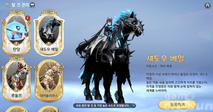 다음은 이벤트 업적으로 얻을 수 있는 매우 빠름 탈것 섀도우 베일이다. 무료로 얻을 수 있는 탈것 중에 가장 빠르고, 지난 업데이트로 보유 탈것 중 가장 빠른 속도의 탈것을 기준으로 속도가 고정되도록 개선된 만큼 전투력이 허락한다면 꼭 얻어놓을 것을 추천한다.