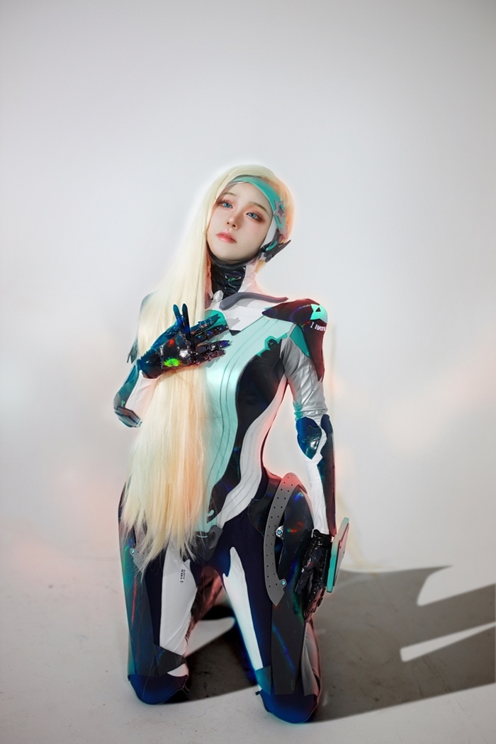 코스플레이어 ‘나리땽’이 어둠 속에서도 빛을 발하는 완전판 드레스를 착용한 ‘광륜의 모나’의 일러스트를 표현하고 있다.