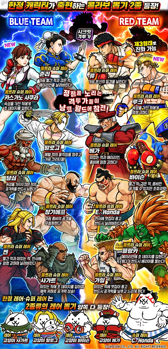 콜라보 한정 캐릭터가 출현하는 ‘스트리트 파이터V 챔피언 에디션’ 뽑기를 BLUE TEAM, RED TEAM 2종류로 나누어 개최한다.