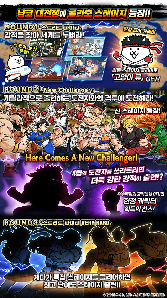 냥코 도장 ‘랭킹의 방’에 기간한정 랭킹 이벤트로 ‘스트리트 파이터V 챔피언 에디션’의 캐릭터가 적으로 등장하는 ‘나보다 강한 녀석과 만나러 간다’가 개최된다.