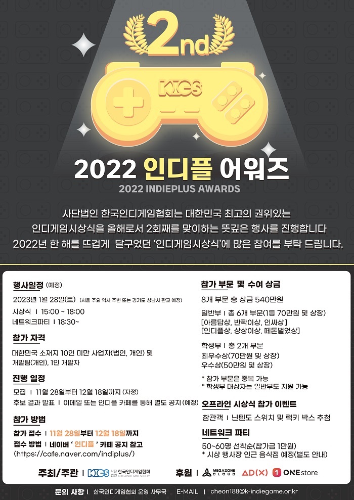 [자료제공 = 한국인디게임협회] 사단법인 한국인디게임협회(협회장 최훈)가 2022년에 출시 및 서비스한 인디게임을 대상으로 한 시상 행사 ”2022 인디플 어워즈“를 개최한다고 30일 밝혔다.