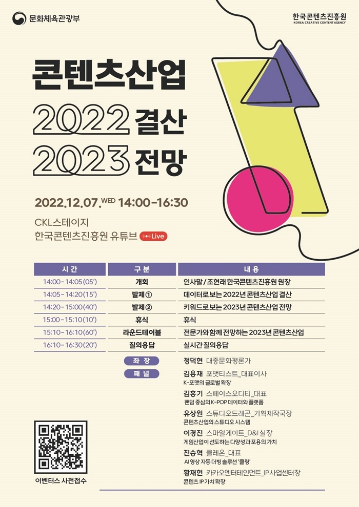 [자료제공 = 한국콘텐츠진흥원] 문화체육관광부(장관 박보균)와 한국콘텐츠진흥원(원장 조현래, 이하 콘진원)은 경기침체에 따른 위기 속 콘텐츠산업의 현재와 미래를 살펴보는 ‘콘텐츠산업 2022년 결산 및 2023년 전망 세미나(이하 콘텐츠산업 결산·전망 세미나)’를 12월 7일 개최한다.