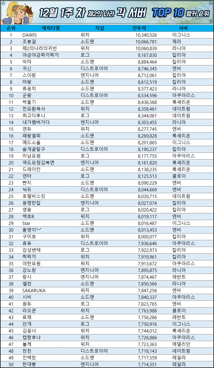 그래서 이번 랭킹 각 직업별 최고 순위 달성자는 지난 랭킹과 거의 같다. 위치는 이그니스 서버 DAWIS가 1위, 소드맨은 제라 서버 조봉걸이 2위, 로그는 칼리아 서버 '야금야금찌끼찌끼'가 4위, 디스트로이어는 엔비 서버 귀신이 6위, 엔지니어는 칼리아 서버 '스이랑'이 7위로 집계됐다.
