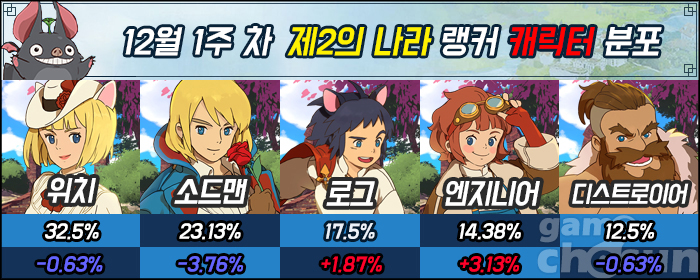 지난주와 전투력이 동일한 유저가 많긴 하지만, 랭킹 자체에는 변화가 있긴 했다. 로그는 2주 연속 상승, 엔지니어는 반등을 이루어내며 우상향을 보여줬다. 다만, 엔지니어는 지난 랭킹에서 하락폭이 너무 컸기 때문에 완전히 회복했다고 보긴 이른 상황이며, 여전히 상위권은 위치와 소드맨이 굳건히 지키고 있는 상황이다.
