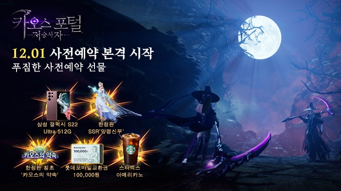 앱마켓 사전예약 참여자 전원에게 한정판 전령인 ‘망령 신부’가 지급되며, 공식 사이트에 핸드폰 번호로 사전예약 참여하면 한정판 칭호 ‘카오스의 약속’이 포함된 푸짐한 보상을 획득할 수 있다. ‘핸드폰 사전예약 쿠폰코드’와 ‘앱마켓 사전예약 쿠폰코드’를 모두 사용한 유저들은 커피 교환권을 받을 수 있으며, 추첨을 통해 갤럭시 S22 울트라 등 특별대상도 증정될 예정이다. 이외에도 공식 라운지 SNS공유 이벤트 참여자는 인게임 보상 외에 10만원 상품권, 커피 교환권을 획득할 수 있는 기회를 얻을 수 있다.