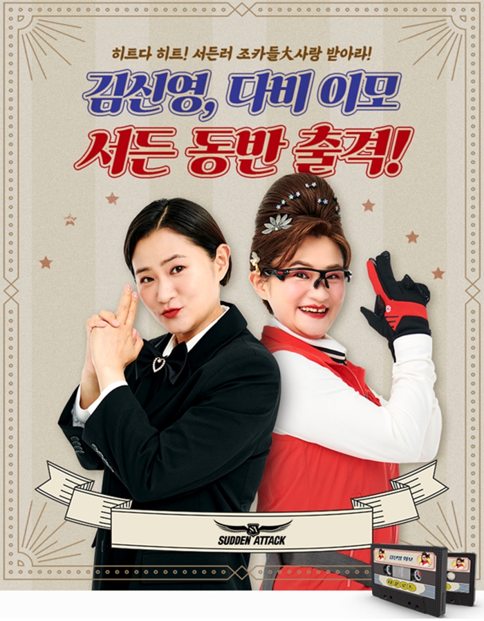 최근 가요 프로그램부터 영화까지 다방면으로 활동 중인 방송인 김신영과 그의 ‘부캐’ 김다비 캐릭터가 ‘서든어택’에 출시된다. 김신영, 김다비 캐릭터는 ‘탬버린 Music’, ‘마이크 Music’ 등 전용 세트 효과를 지니며, 캐릭터 세트 장착 후 ‘랭크전’을 플레이하면 50%의 추가 경험치를 획득할 수 있다. 12월 15일까지 김신영, 김다비 캐릭터 보유 기간 300일 이상 달성 시 영구제 캐릭터 선택권을 제공하며, 이를 획득한 서든러를 대상으로 추첨을 통해 싸인 서든어택 블루투스 마이크와 싸인 마우스패드를 지급한다.