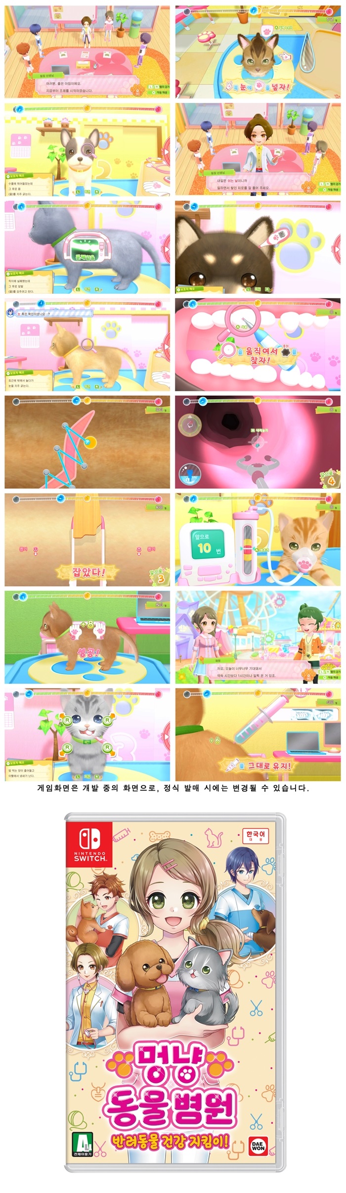 어린이도 이해하기 쉽게 번역된 게임 텍스트와 함께 등장인물의 주요 대사를 한국어로 더빙하여 가족 모두 손쉽게 즐길 수 있는 구성으로 크리스마스 선물로도 좋은 반응이 기대되는 닌텐도 스위치 전용 소프트웨어 ‘멍냥 동물 병원 반려동물 건강 지킴이!는 크리스마스를 앞둔 12월 22일 목요일, 희망소비자가격은 49,800원으로 발매된다. 패키지 외에 닌텐도 e숍을 통해 다운로드 버전으로도 구매 가능하며 게임에 관한 상세한 내용은 대원미디어에서는 공식 소개페이지와 홍보 영상으로 참고할 수 있다.