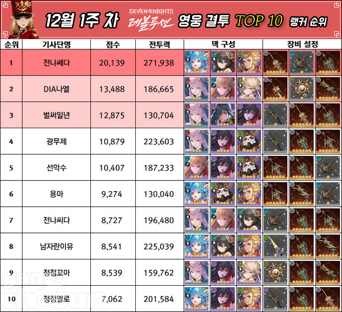 넷마블의 모바일 MMORPG '세븐나이츠 레볼루션'의 12월 1주차, 생도 결투 랭킹 1위가 또다시 교체되는 한편, 영웅 결투와 전투력 부문에서는 '전나쎄다' 유저가 계속해서 최정상 자리를 차지하는 모습을 보여줬다.