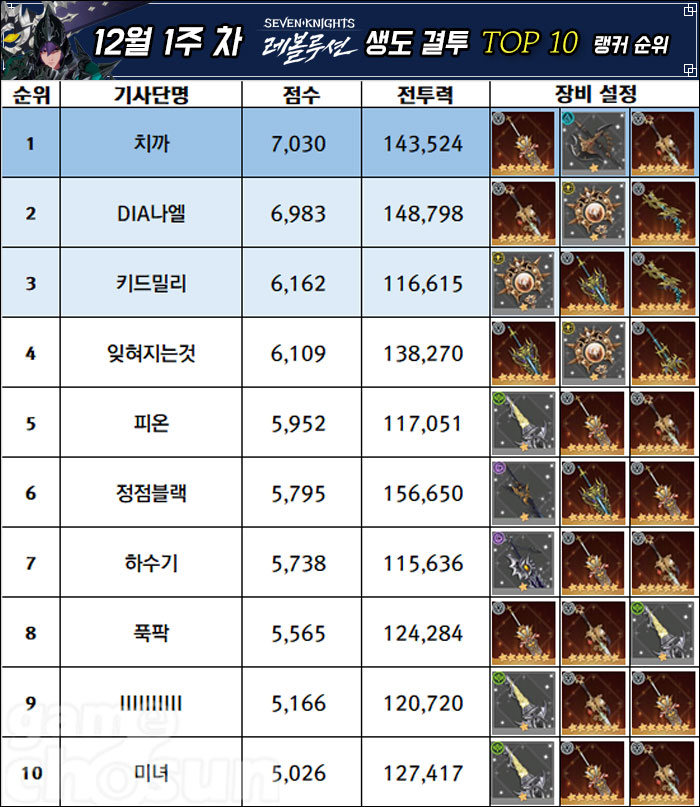 전투력 랭킹에 전나쎄다 유저가 12주째 1위를 굳건히 하고 있다. 전나쎄다의 뒤를 이어서 킹리치, 츄르아빠, 정점제일검 유저까지 동일하게 순위와 전투력을 유지중이다. mmrr 유저는 패닉 유저를 제치고 5위에 랭크됐다.