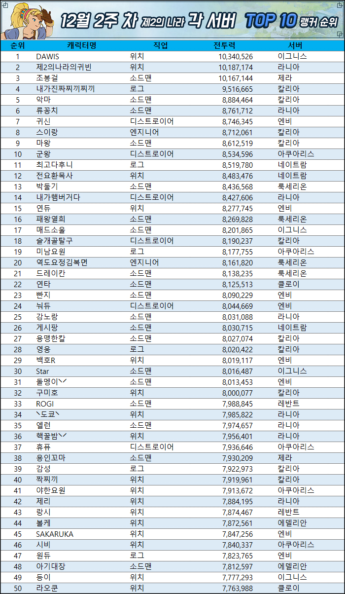 이그니스 서버 위치 'DAWIS'가 전투력 10,340,526을 달성한 뒤 큰 움직임 없이 1위를 유지하고 있다. 반면 라니아 서버 위치 '제2의나라의귀빈'은 전투력 126,335를 상승시키며 제라 서버 소드맨 '조봉걸'을 추월해 2위에 올랐다. 조봉걸은 비록 추월당하긴 했지만, 제2의나라의귀빈과 전투력 2만 가량 차이로 바짝 쫓고 있다.