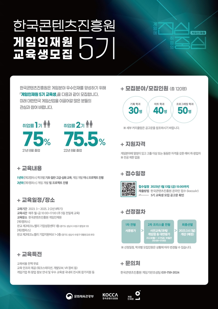 [자료제공 = 한국콘텐츠진흥원] 문화체육관광부(장관 박보균)와 한국콘텐츠진흥원(원장 조현래, 이하 콘진원)은 게임 현장의 실무 능력을 갖춘 핵심 인재를 양성하기 위한 게임인재원 5기 교육생을 23년 1월 13일까지 모집한다.