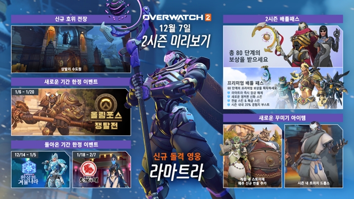 새로운 영웅 ‘라마트라’, 신규 전장 ‘샴발리 수도원’ 그리고 신들과 전설의 근원인 ‘그리스 신화’를 테마로 구성된 오버워치 2의 2시즌은 Windows® PC의 Battle.net®, Xbox Series X|S, Xbox One, PlayStation®5, PlayStation®4, Nintendo Switch™ 등 여러 플랫폼을 통해 누구나 즐길 수 있다. 지난 10월 출시된 오버워치 2는 출시 한달여 만에 전세계적으로 3,500만 명이 즐기는 등 한국은 물론 전세계적으로 좋은 반응을 얻고 있다. 오버워치 2는 9주마다 정기적인 시즌 업데이트를 진행할 예정이다.