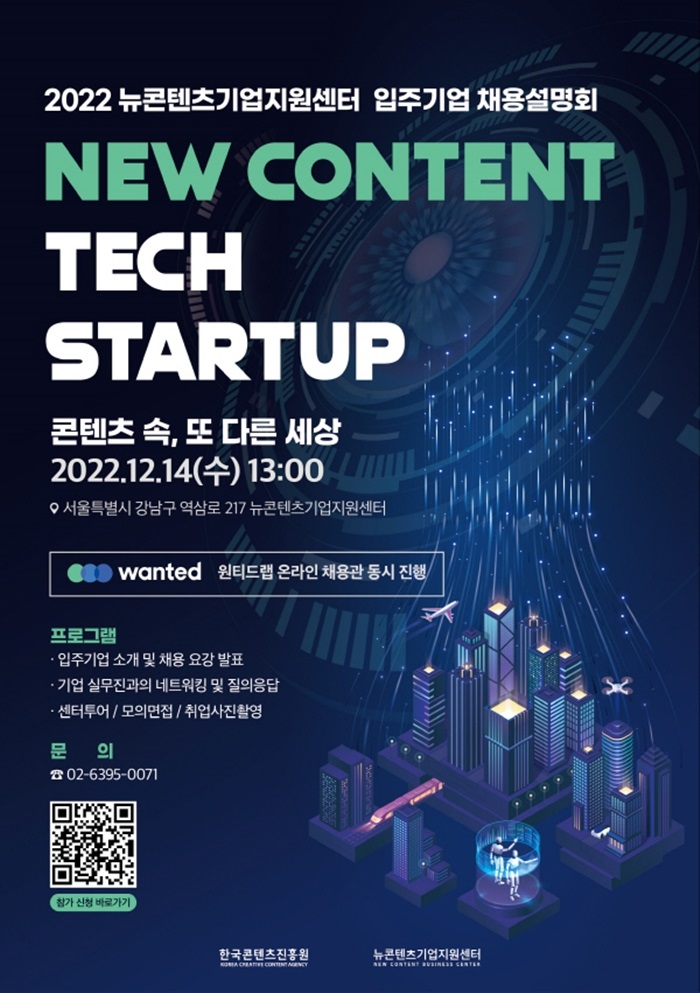 [자료제공 = 위너스피알] 한국콘텐츠진흥원(원장 조현래, 이하 콘진원)은 뉴콘텐츠기업지원센터 입주기업에게 인재 확보의 기회를 제공하기 위해 입주기업 채용설명회를 오는 14일 개최한다.