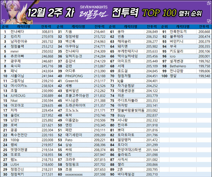전투력 TOP 100 기준 평균 전투력은 215,179이며, 지난주 대비 약 3,300가량 상승했다.