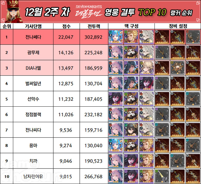넷마블의 모바일 MMORPG '세븐나이츠 레볼루션'의 12월 2주차, '치까' 유저가 생도 결투 랭킹 1위를 2주 연속 차지했으며 영웅 결투와 전투력 부문에서는 '전나쎄다' 유저가 1위 자리를 지켜냈다.