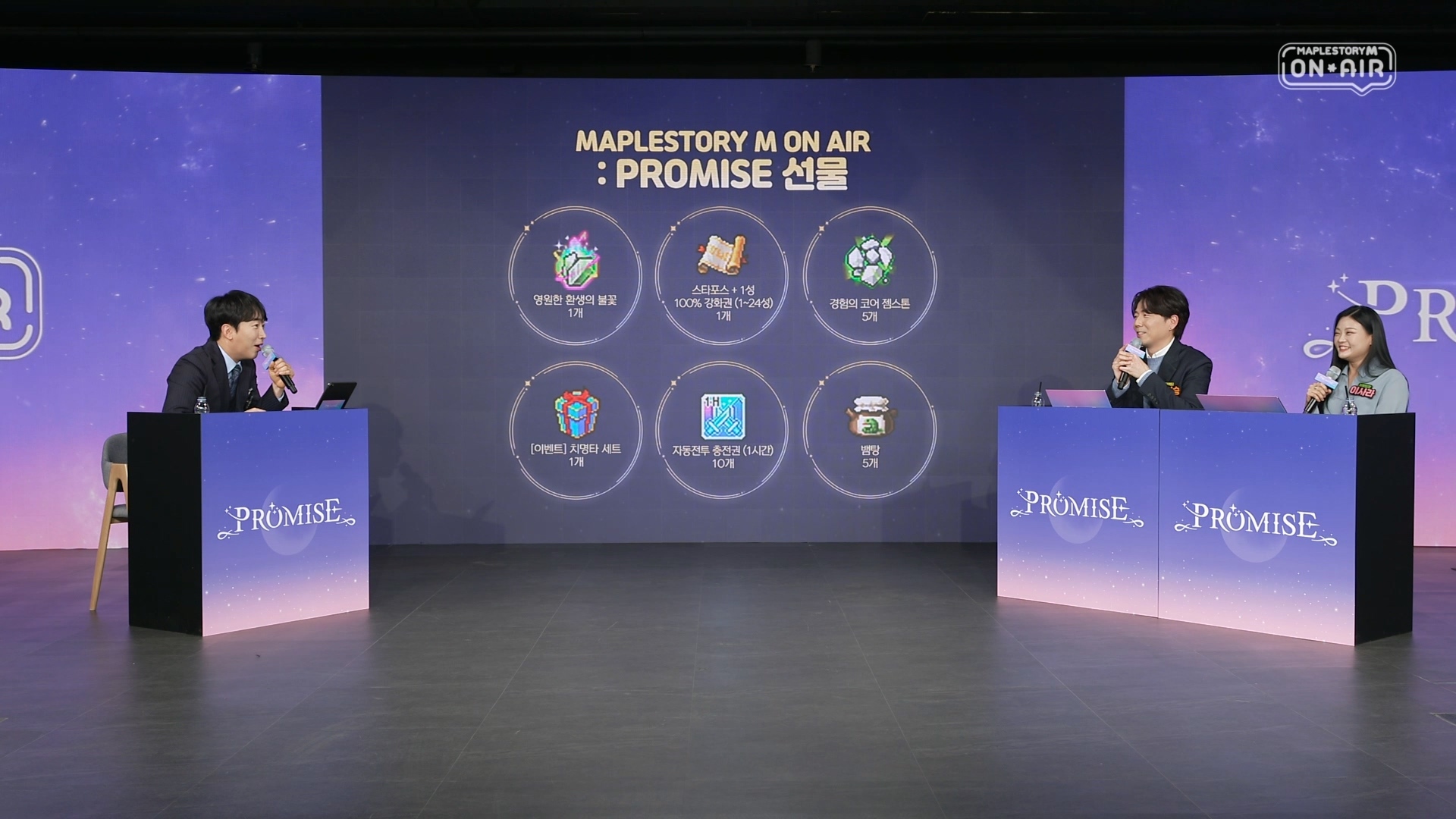 [자료제공 = 넥슨] ‘메이플스토리M’이 겨울 업데이트를 앞두고 지난 12일 라이브 방송 ‘MAPLESTORY M ON AIR – PROMISE’를 진행했다. 이날 ‘메이플스토리M’ 개발을 총괄하는 넥슨 김현승 디렉터, 이사라 기획팀장이 출연해 올 겨울 업데이트 정보, 이용자와의 약속 이행 현황, 2023년 4월까지 로드맵, 첫 오리지널 캐릭터 등 주요 내용을 소개했다. 이와 함께 실시간 채팅으로 시청자 궁금증에 대해 답변하는 시간을 갖고, ‘영원한 환생의 불꽃’, ‘태풍 성장의 비약’, ‘퍼펙트 각인의 인장’ 등 풍성한 깜짝 보상을 공개해 큰 호응을 얻었다.