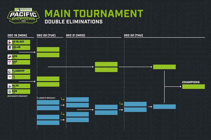12월 19일(월)부터 22일(목)까지 진행되는 ‘2022 오버워치 컨텐더스 퍼시픽 쇼다운’ 본선에는 예선을 통과한 DAF E-sport을 비롯해 컨텐더스 지역인 대한민국, 중국, 호주/뉴질랜드 총 8팀이 출전한다. 본선은 더블 엘리미네이션 토너먼트로 진행된다.