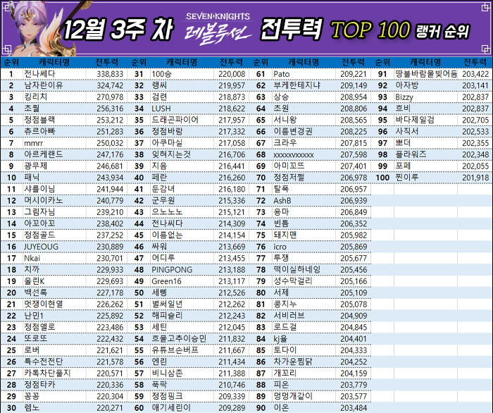 전투력 TOP 100 랭커의 평균 전투력은 218,965이며, 지난주와 비교했을 때 전투력 3,786이 상승했다.
