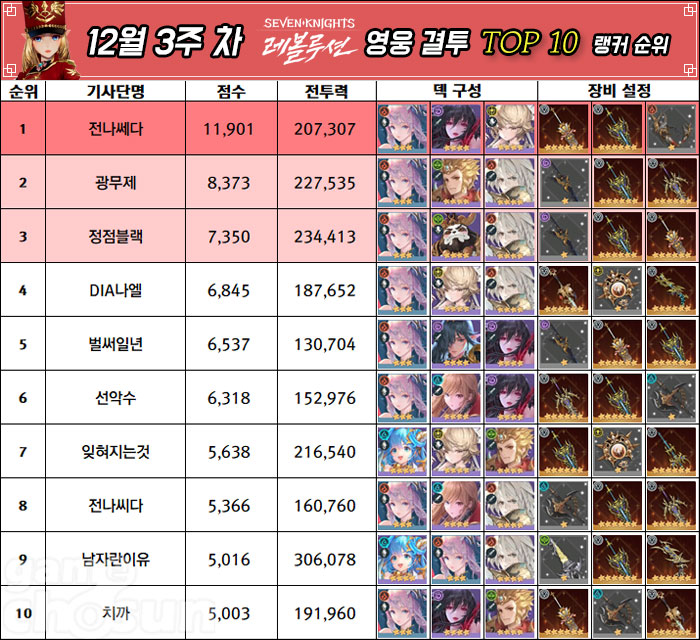넷마블의 모바일 MMORPG '세븐나이츠 레볼루션'의 12월 3주차, 생도 결투 순위가 크게 뒤바뀌는 한편, '전나쎄다' 유저는 영웅 결투 부문 4주 연속 1위를 차지했다. 또 전나쎄다 유저는 전투력 랭킹 부문에서도 14주째 최정상을 이어가고 있는 상태다.
