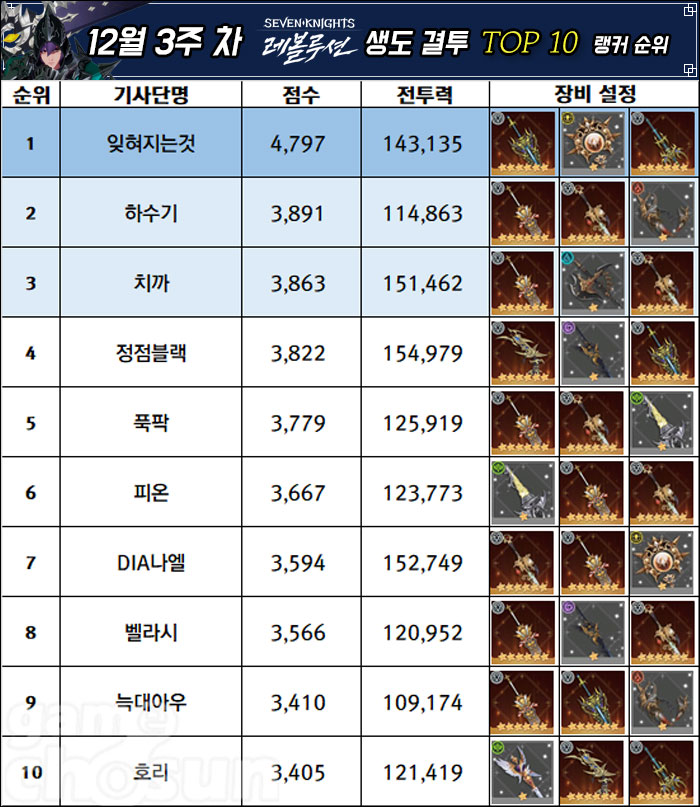 순위가 6단계나 상승한 하수기 유저는 그랑검과 창천검, 그리고 카일 무기 조합을 사용했으며 생도 결투 TOP 10에 새롭게 이름을 올린 늑대아우 유저도 영웅 무기로 광염쇄를 택했다. 광염쇄가 계속해서 랭커들의 선택을 받을지 귀추가 주목된다.
