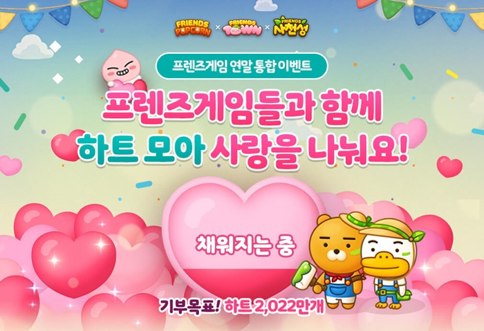 모바일 캐주얼게임 ‘프렌즈팝콘’, ‘프렌즈타운’, ‘프렌즈사천성’에서는 오는 22일부터 31일까지 ‘하트 모아 사랑 나누기’ 기부 이벤트를 실시한다. 본 이벤트는 프렌즈게임 3종에서 진행하는 이용자 참여형 기부 이벤트로, 이용자들이 게임 내에서 하트 2,022만개를 모으면 카카오게임즈가 3,000만원을 기부하는 방식이다. 이 외에도 각 게임별 이모티콘 획득 이벤트도 진행된다.