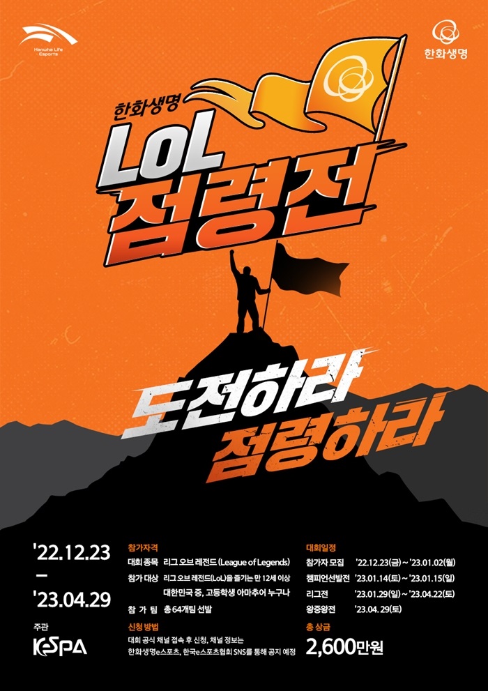 ‘한화생명 LoL 점령전’이라는 명칭으로 열리는 이번 대회는 ‘리그 오브 레전드’를 즐기는 만 12세 이상의 대한민국 중∙고등학생(프로 선수 제외)이라면 누구나 참여할 수 있다.