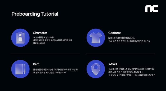 ‘프리보딩 패키지’는 입사가 확정된 시점부터 첫 출근 전까지 엔씨(NC)에 연착륙할 수 있도록 사전에 필요한 사항을 준비하는 과정이다. ▲Log-in NC ▲웰컴 기프트 두 가지로 구성됐다.