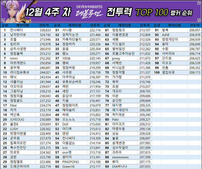12월 4주차, 전나쎄다 유저의 전투력 상승은 이뤄지지 않았으나 여전히 1위를 기록하고 있으며, 남자란이유 유저 또한 2위를 유지했다. 초월 유저는 전투력을 약 17,000 가량 상승시키면서 3위로 올라섰으며, 킹리치 유저는 한 계단 하락했다.