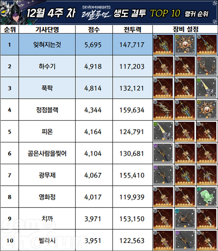 잊혀지는것 유저가 지난주에 이어 12월 4주차 생도 결투 1위 수성에 성공했다. 또 지난주 5위를 기록했던 푹팍 유저가 3위까지 순위가 상승했으며, 하수기 유저는 잊혀지는것 유저와 점수차를 소폭 줄이면서 1위 자리를 노리고 있다.
