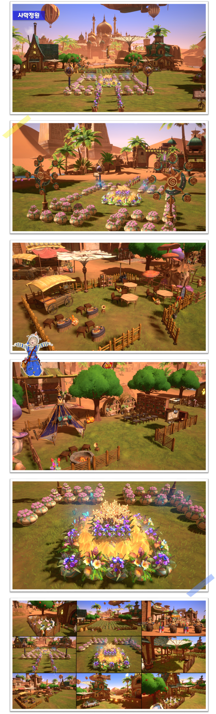 보리궁디: 농장 콘셉트는 ‘사막 정원’입니다. ‘황금길 오아시스’ 맵의 배경이 사막이다 보니 어떻게 꾸며야 할지 고민이 많았습니다. 고민하던 끝에 메마른 사막맵이 생기있게 보였으면 해서 맵 가운데에 화사한 꽃밭을 메인으로 둔 ‘사막 정원’을 만들었습니다.