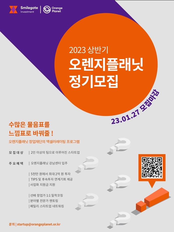 [자료제공 = 스마일게이트] 오렌지플래닛 창업재단(센터장 서상봉, 이하 ‘오렌지플래닛’)은 ‘2023년 상반기 정기모집’(이하 ‘정기모집’)을 실시한다고 2일(월) 밝혔다.
