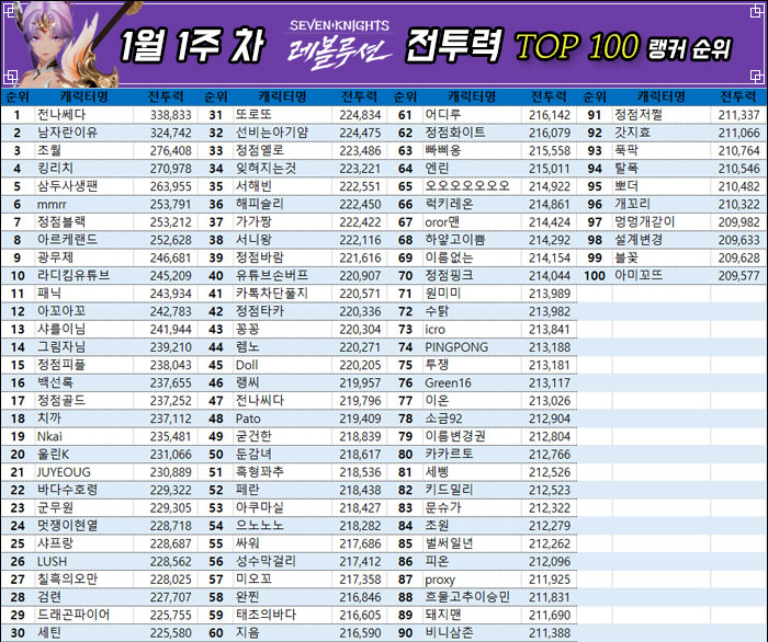 넷마블의 모바일 MMORPG '세븐나이츠 레볼루션'의 1월 1주차, 생도 결투의 1위가 교체됨과 동시에 '전나쎄다' 유저의 영웅 결투 5주 연속 1위 기록이 깨지는 등 큰 변화가 있었다. 전투력 랭킹에서는 '전나쎄다' 유저가 여전히 최정상 자리를 유지하는 모습을 보여줬다.