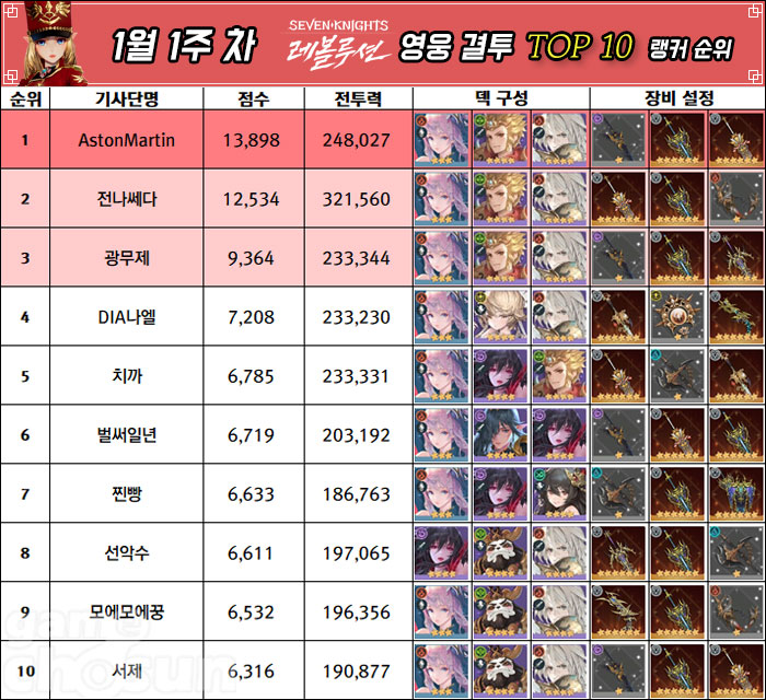 12월 4주차 영웅 결투와 전투력 랭킹 2관왕에 오른 전나쎄다 유저는 아쉽게 영웅 결투에서는 1위 자리를 내주었으나, 전투력 랭킹에서는 16주 째 최정상을 내달리면서 건재함을 과시했다. 남자란이유 유저도 2위를 계속 유지중이며, 초월 유저가 킹리치 유저를 제치고 3위에 이름을 올렸다.