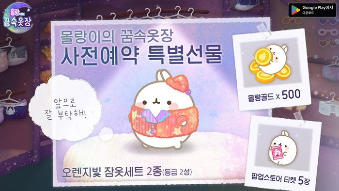 ‘몰랑이의 꿈속 옷장’은 전 세계 190개국에 애니메이션으로 수출된 국산 캐릭터 IP인 ‘몰랑이(Molang)'를 모바일 게임화한 프로젝트로 코디 시뮬레이션 장르에 퍼즐 장르가 결합된 스토리 진행형 게임이다.