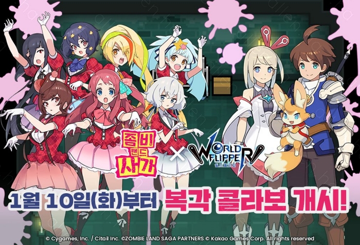 [자료제공 = 카카오게임즈] 카카오게임즈(대표 조계현)는 11일, 사이게임즈(대표 와타나베 코우이치)와 사이게임즈의 자회사인 시테일이 공동 개발한 모바일 액션 RPG ‘월드 플리퍼’에 오리지널 TV 애니메이션 ‘좀비 랜드 사가’와의 복각 컬래버레이션 이벤트를 진행한다고 밝혔다.