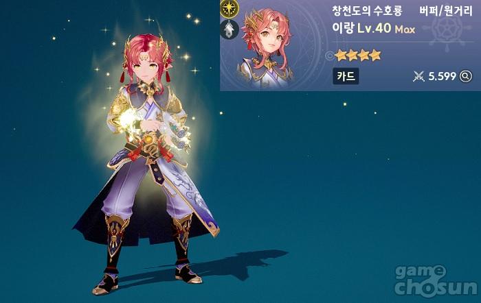 4성 빛속성 이랑은 힐러임과 동시에 공격력을 증가시킬 수 있는 버퍼 캐릭터다. 모든 액티브 스킬이 필드 설치형 기술이며, 1번 액티브 스킬은 지속 회복 형태의 힐, 2번 액티브 스킬은 공격력 증가, 3번 액티브 스킬은 모든 상태이상 저항 증가의 효과를 제공한다.