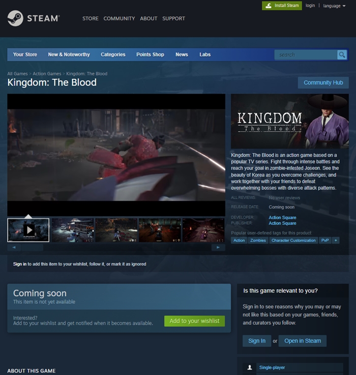 한편 ‘킹덤 : 왕가의 피’는 이번 스팀 페이지 오픈을 통해 개발 상황 및 최신 정보가 업데이트될 예정이며 스팀 페이지에서는 게임에 대한 공식 소개 영상, 스크린샷, 세계관 등을 만나볼 수 있다.