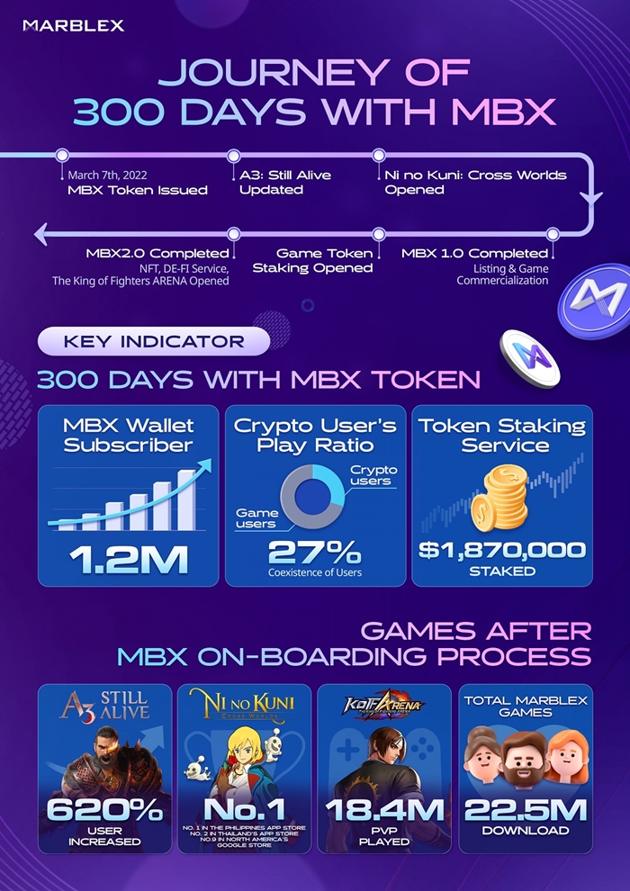 이외에도 마브렉스는 MBX 생태계에 온보딩된 게임들의 총 다운로드 수(약 2,252만), 게임 토큰 채굴 대비 인게임 소진율(약 95%) 등 지난해 이뤄낸 성과를 비롯해 다중 체인 브릿지로 구성돼 보안성과 사용성이 증대된 ‘MBX 워프(WARP)’를 공개하며 생태계에 대한 기대감을 높였다.