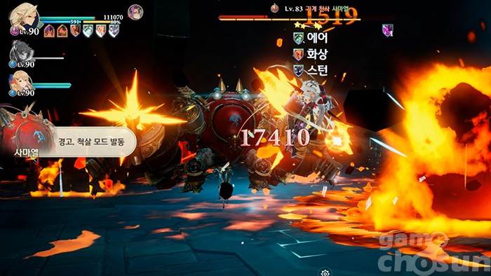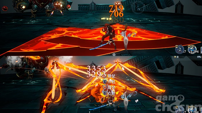 다음은 반드시 상태 이상 저항을 준비해야 하는 맵 전체 공격이다. 에어와 화상, 스턴을 동시에 사용해 캐릭터를 압박하며, 행동 불가 지속 시간이 길어 후속 공격에 무방비하게 노출되는 패턴이다. 앞선 패턴과 달리 회피도 어렵기 때문에 꼭 저항을 맞추자.