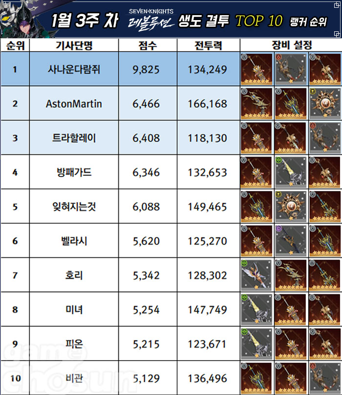 전나쎄다 유저의 전투력 338,833을 넘어서는 유저는 1월 3주차에도 등장하지 않았다. 2위 남자란이유, 3위 초월 유저가 전투력을 유지하고 있다.
