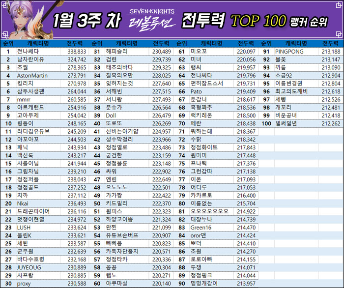 1월 3주차 전투력 TOP 100 랭커의 평균 전투력은 228,605이며, 지난주 대비 약 2,200 가량 상승한 것으로 나타났다.