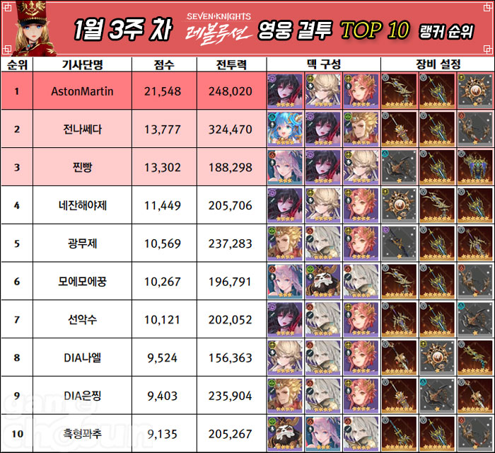 넷마블의 모바일 MMORPG '세븐나이츠 레볼루션'의 1월 3주차, '사나운다람쥐' 유저가 3주 연속으로 생도 결투 1위를 기록했으며, 'AstonMartin' 유저 또한 3주 연속으로 영웅 결투 1위를 차치했다. 전투력 랭킹 부문에서는 '전나쎄다' 유저가 18주째 1위 기록을 이어가고 있다.