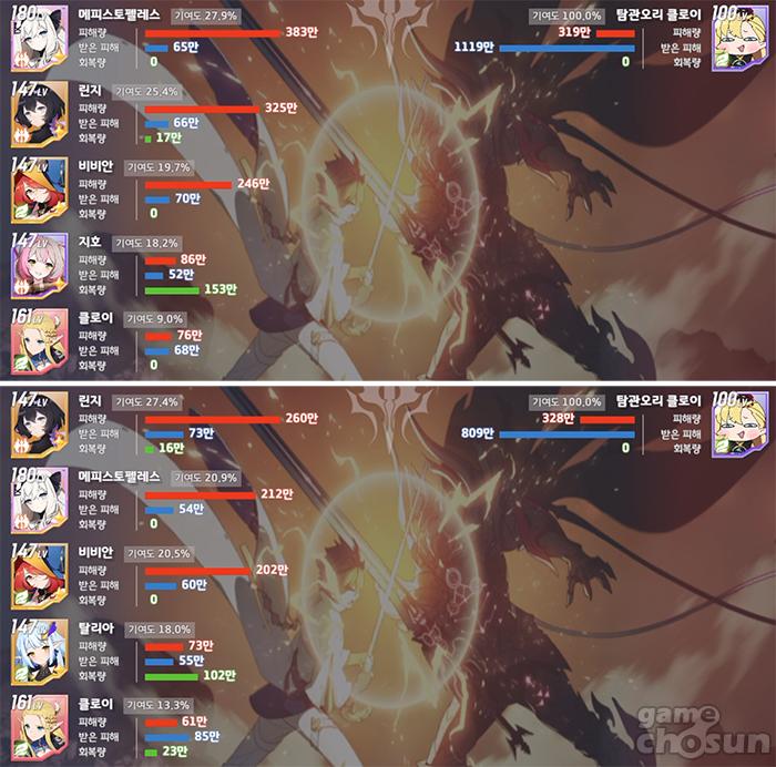 더 오래 전투했음에도 지호 파티가 받은 딜량이 더 적다. 가속 디버프의 영향. = 게임조선 촬영