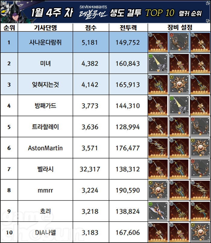 3위 서니왕 유저의 상승세도 눈길을 끌고 있다. 서니왕 유저는 1월 3주차 전투력 랭킹 37위였으나, 전투력을 약 80,000 가량 상승시키면서 3위까지 올랐다.
